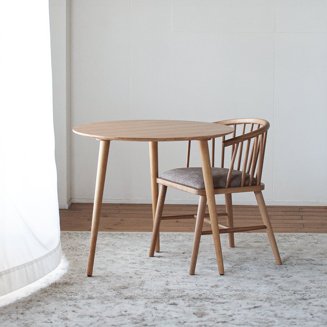 こちらの商品は、オーク材のラウンドダイニング( ※4本脚 )の姉妹品です。違いは脚の本数のみです。3本脚は、椅子がテーブルにおさまる利点があり、1人用として最適です。※椅子のおさまりは、脚間サイズを参照下さい。
