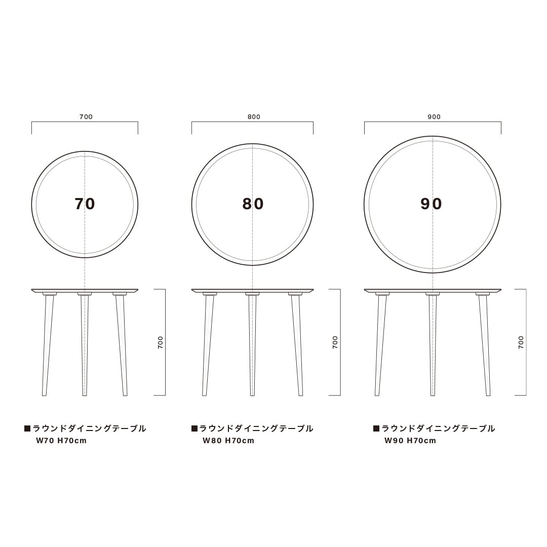 オーク材の3本足ラウンドダイニング[3サイズ 70cm 80cm 90cm] セミオーダー 天然突板 日本製